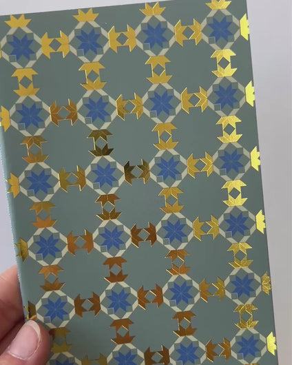 Soft, thread-bound notebooks featuring five cozy quilt patterns and warm color schemes (with gold accents!) to choose from. Handy in size, each notebook measures 4 in x 6 in and contains 32 lined pages. Take them with you everywhere to jot down thoughts, notes, and ideas. The following quilt block patterns are featured: Young Man’s Fancy, Castle Garden, Chinese Holiday, Autumn Leaf, and Stars & Cubes. FSC Paper
