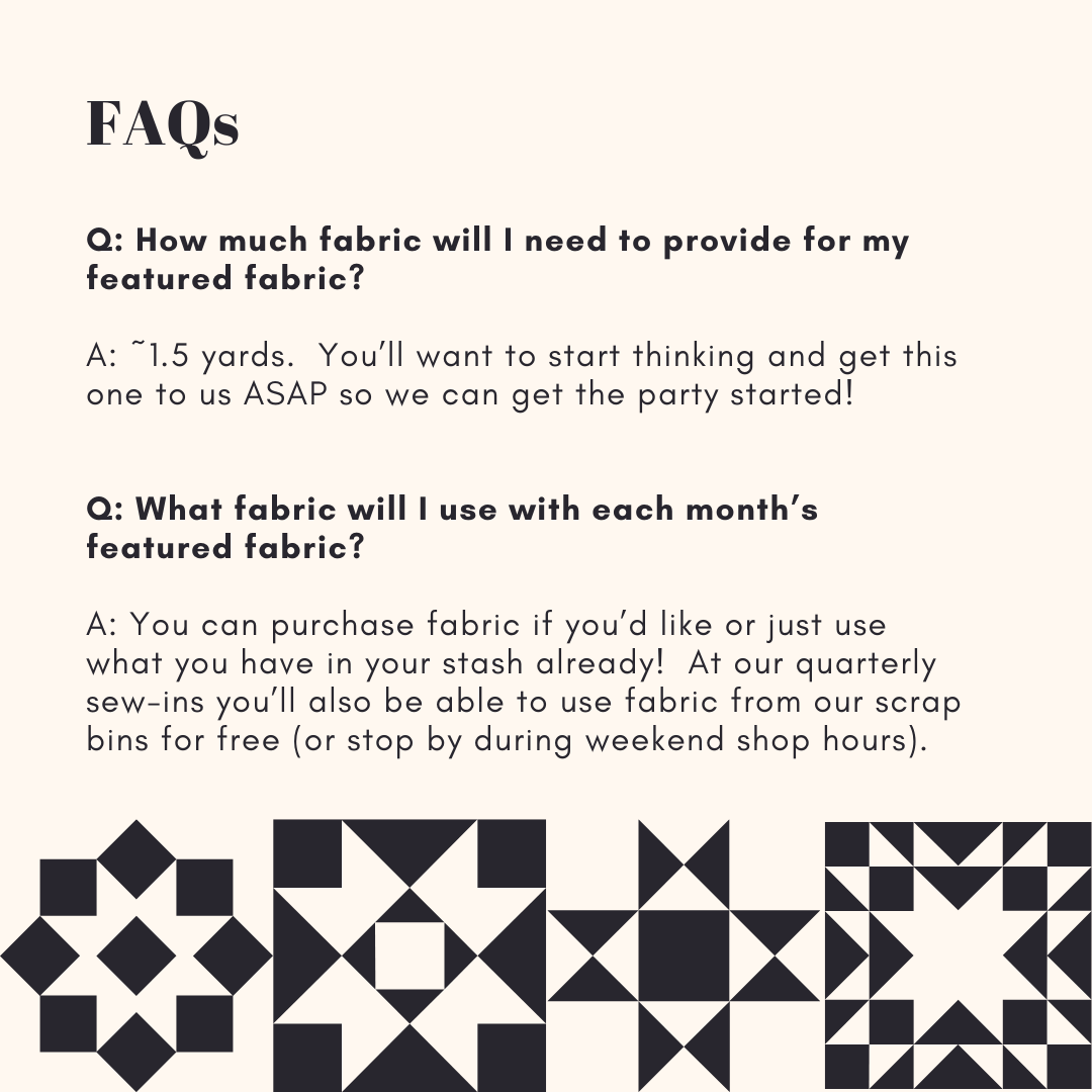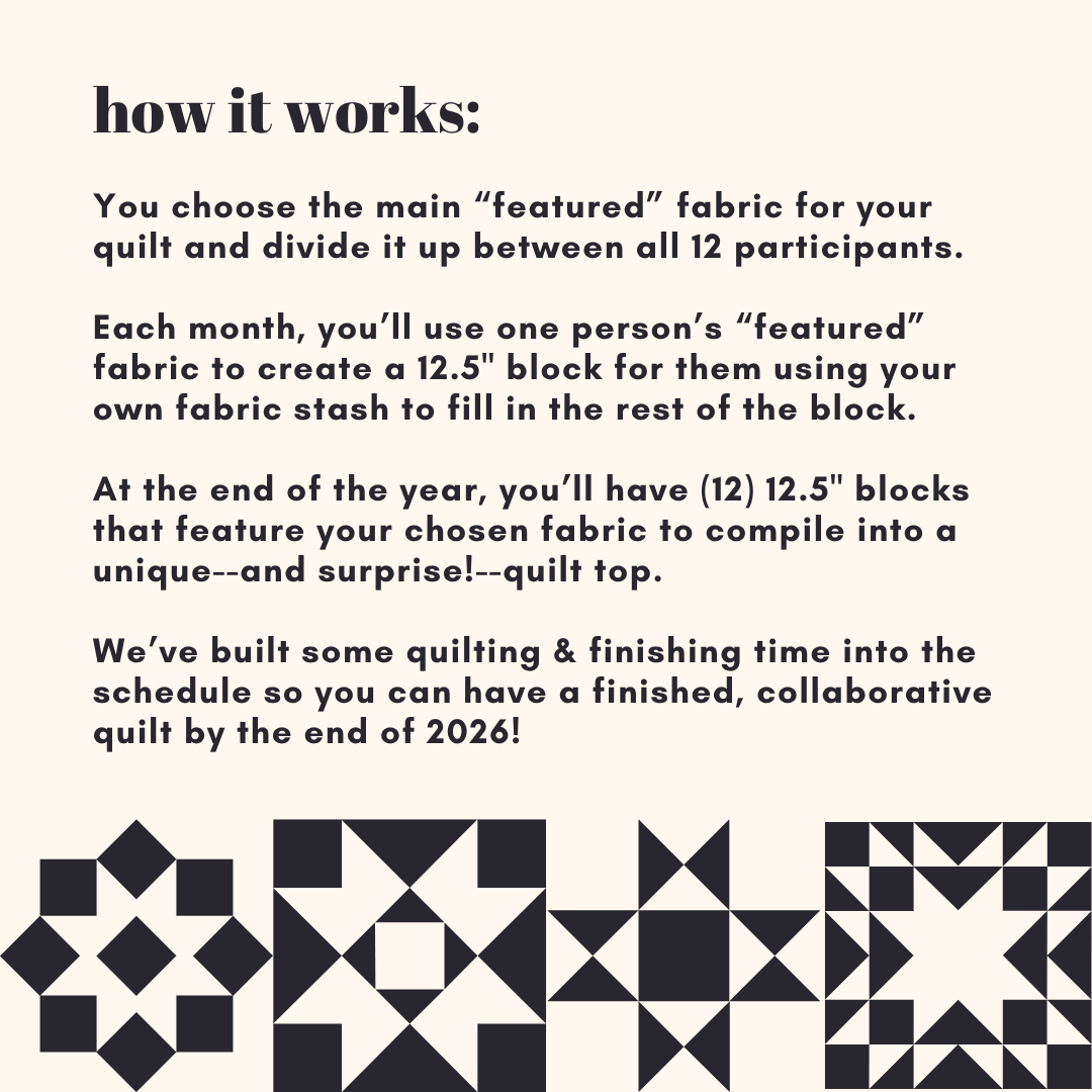You choose the main “featured” fabric for your quilt and divide it up between all 12 participants (~1.5 yards total). Each month, you’ll use one person’s “featured” fabric to create a 12.5" block for them using your own fabric stash to fill in the rest of the block. At the end of the year, you’ll have (12) 12.5" blocks that feature your chosen fabric to compile into a unique--and surprise!--quilt top. We’ve built some quilting & finishing time into the schedule so you can have a finished, collaborative quilt by the end of 2026!