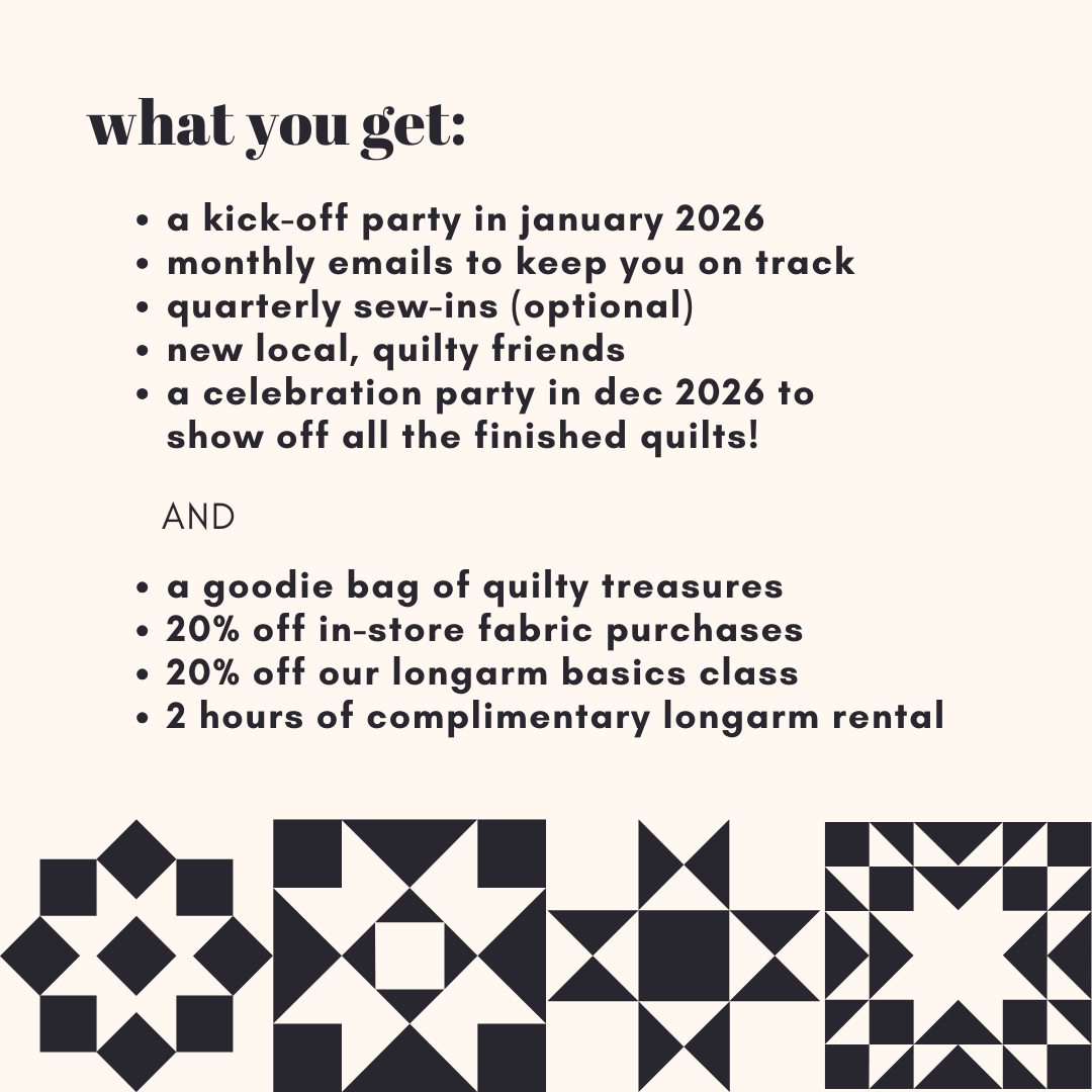 Each quarter, we'll have optional studio time to get together and work on your block of the month. While our time together won't be an instructional class with step-by-step guidance (since everyone is making something different!), we would be happy to help with colors, design, block construction--even techniques like Foundation Paper Piecing, etc. Plus, you'll get to meet and sew with others in this year's cohort and maybe get a sneak peek of others making blocks for you!