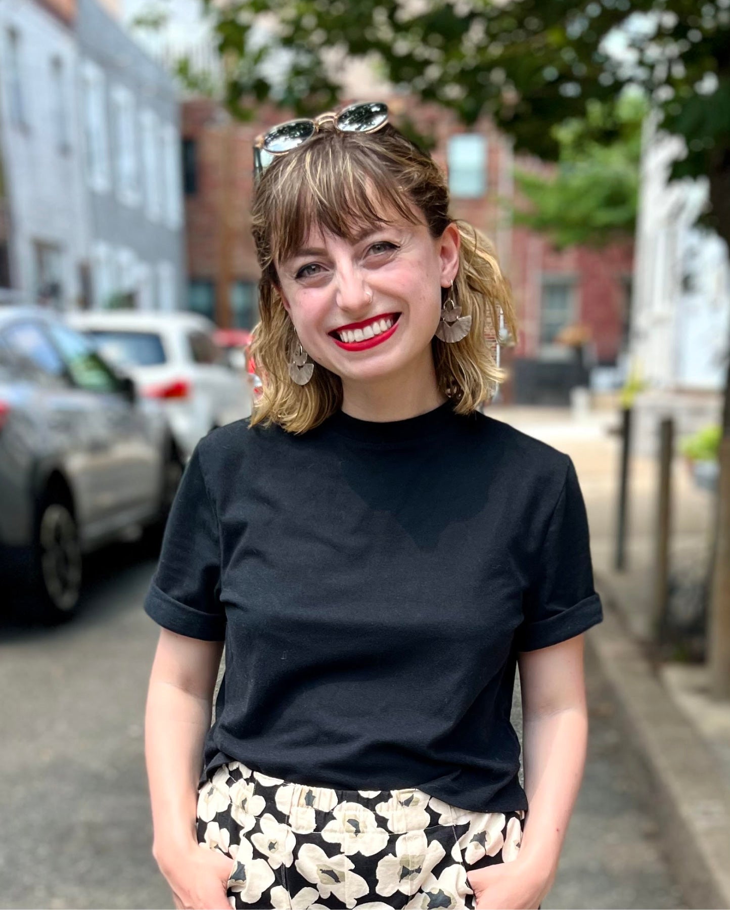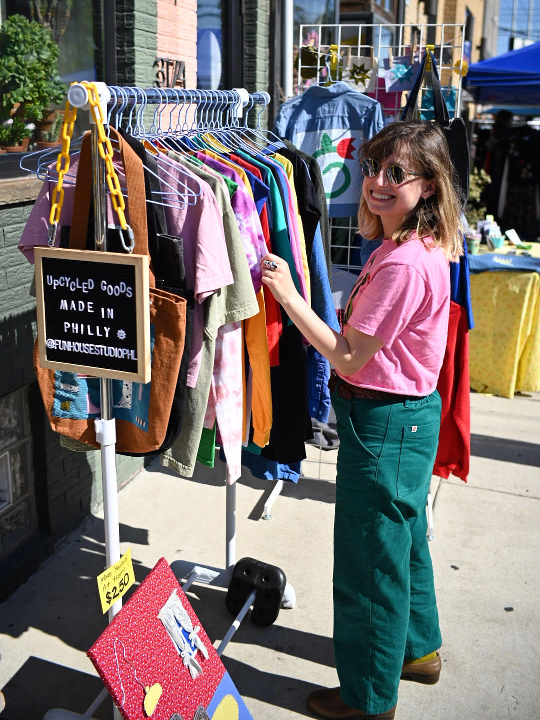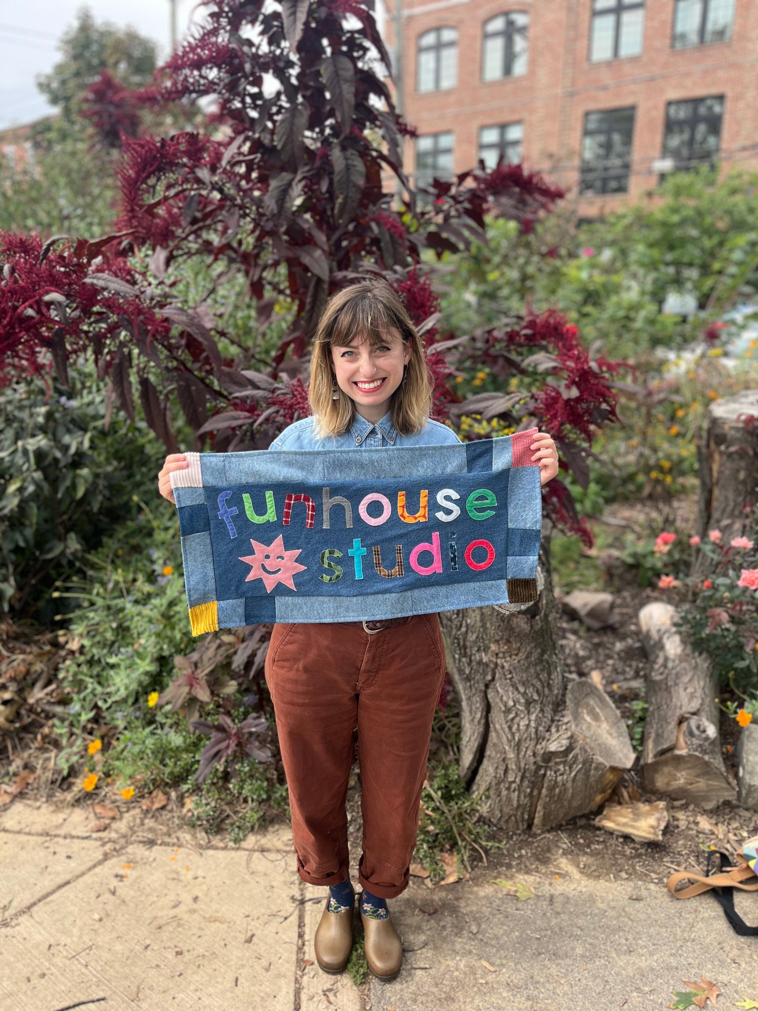 Bio: Sharon Hillman (she/her) is a designer, illustrator, and textile artist in Philadelphia. She is a freelance graphic designer and runs a small business called Funhouse Studio. Her work involves upcycling clothing and accessories which she sells at markets and pop ups around Philly. Much of her inspiration is drawn from nature, architecture, and furniture which is reflected in many of her designs. Her mission is to create something new and exciting out of existing materials with the goal of keeping textile waste out of landfills. Her Instagram handle is @funhousestudiophl.