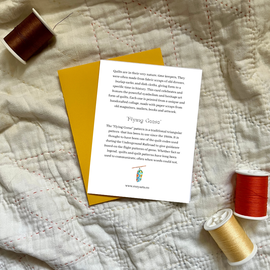 Quilts and quilt patterns have long been used to communicate, often when words could not. These cards celebrate and honor their powerful symbolism and my quilting heritage. Each one is printed from a unique and handcrafted collage, made with love from recycled paper, magazines and scraps. In my work and my life I am constantly reminded that when we put our hands to tasks, our hearts can shine.