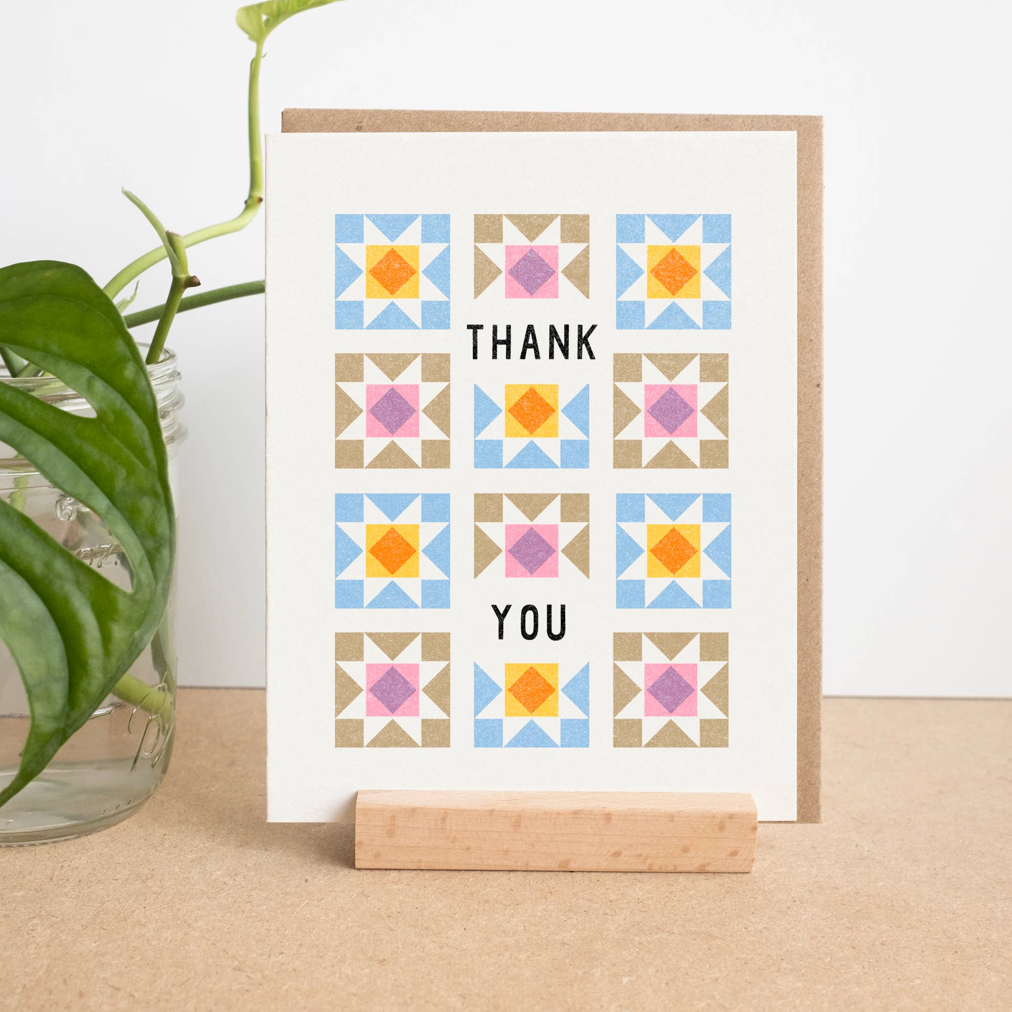 This colorful Risograph thank you card features a vibrant quilt-inspired design, like wrapping someone up in warm gratitude. A keepsake-worthy way to say thank you that feels personal and cozy.